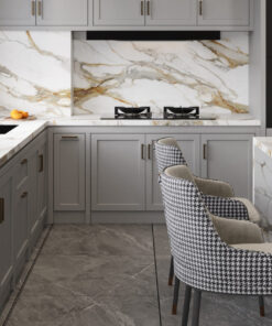 Unlike traditional engineered stone, the Printed Quartz technology allows for multi-layered, organic patterns that include warm metallic gold accents alongside traditional grey tones. These large-scale veins flow across the surface with natural energy, making it an ideal choice for expansive surfaces where the pattern can be showcased in its full, uninterrupted glory. Calacatta Royale combines the historical prestige of royal marble with the indestructible performance of 21st-century engineering.