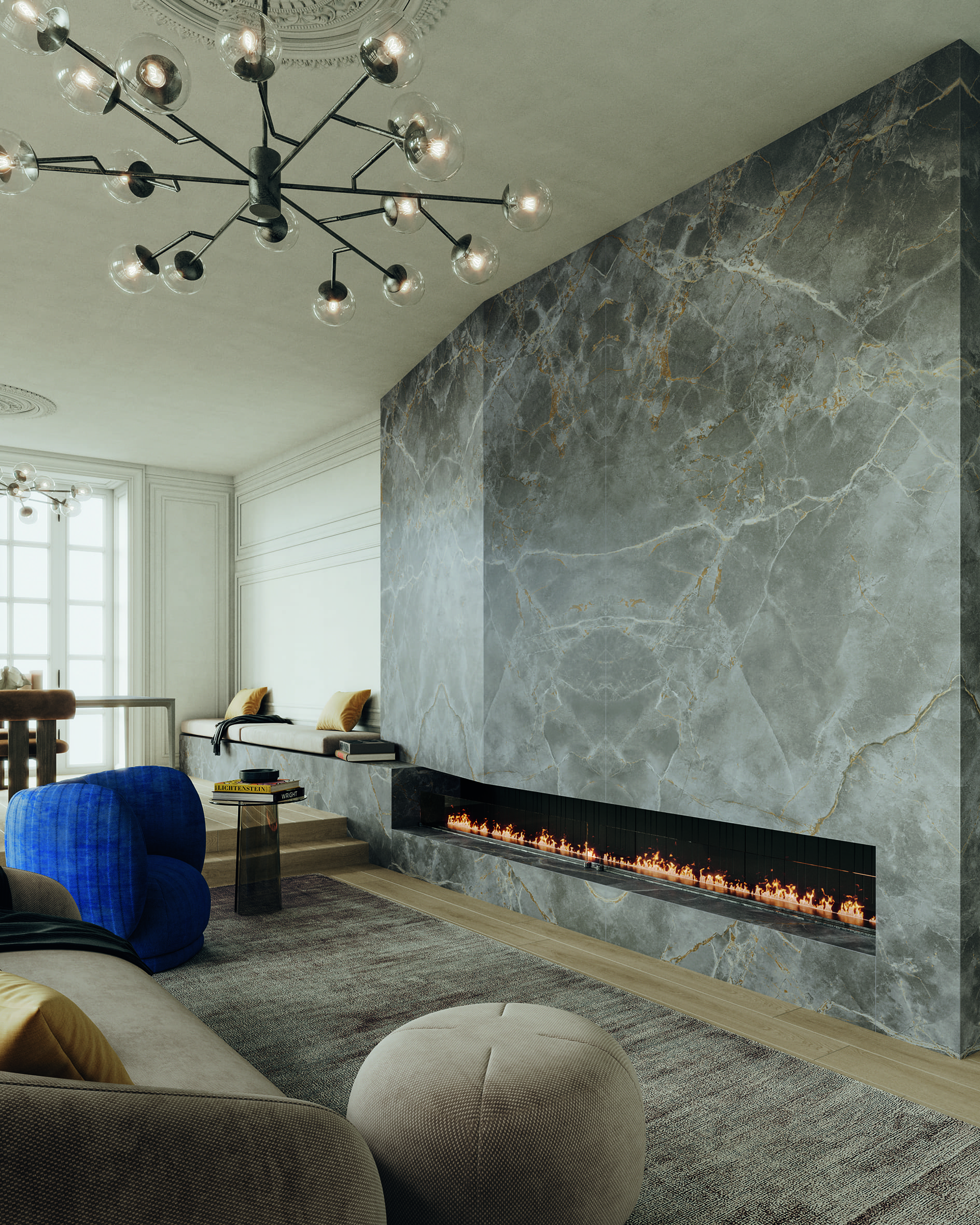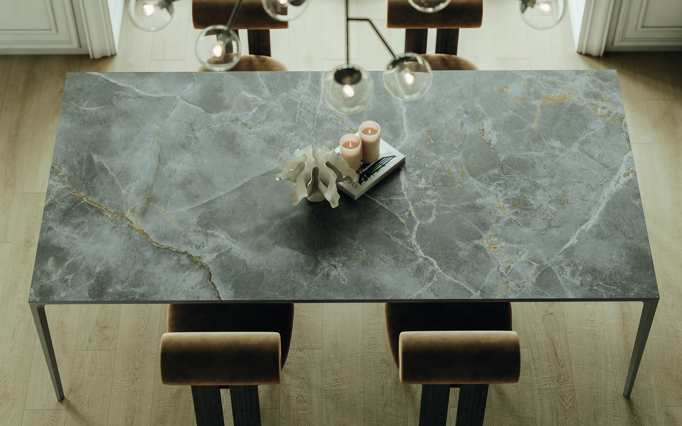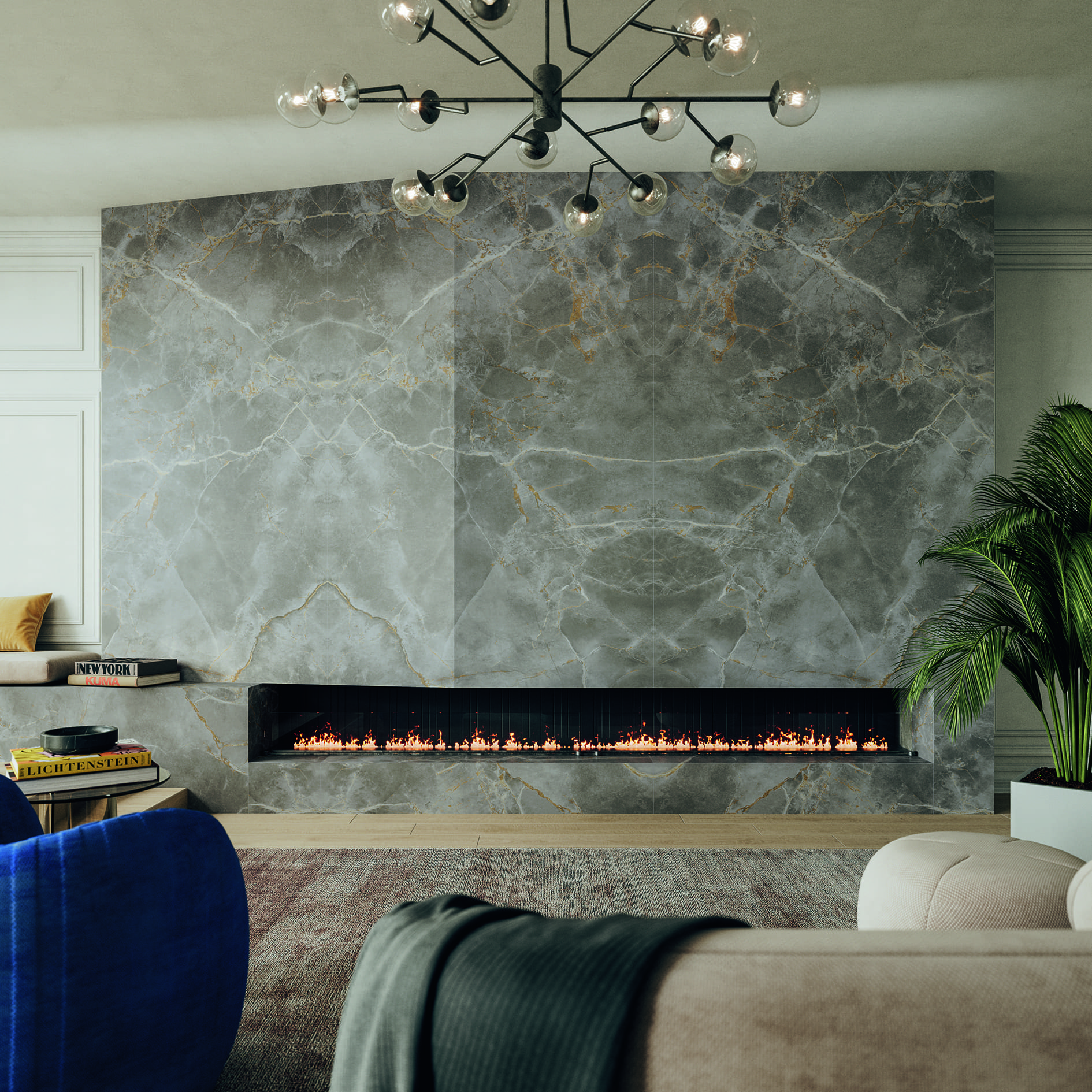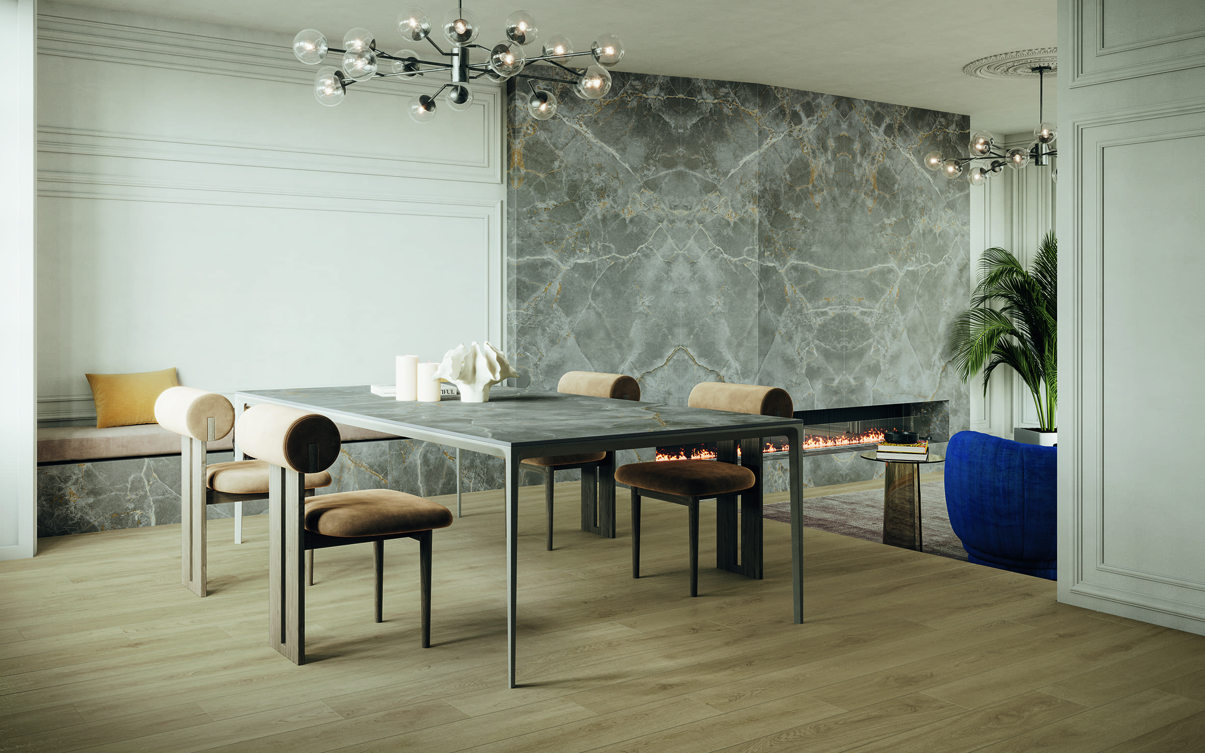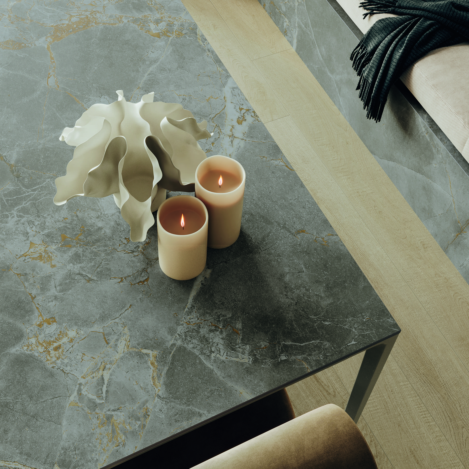Bring the timeless beauty of the Italian forests into your home with Fior Di Bosco. This porcelain masterpiece is designed to mimic one of the most sought-after marbles in the design world. The surface presents a complex, dusty grey foundation that feels both modern and historically rich. What sets Fior Di Bosco apart is its intricate veining structure: sharp, electric white lines crisscross the slab, softened by delicate touches of gold and orange-brown oxides that add warmth and depth to the cool grey base.