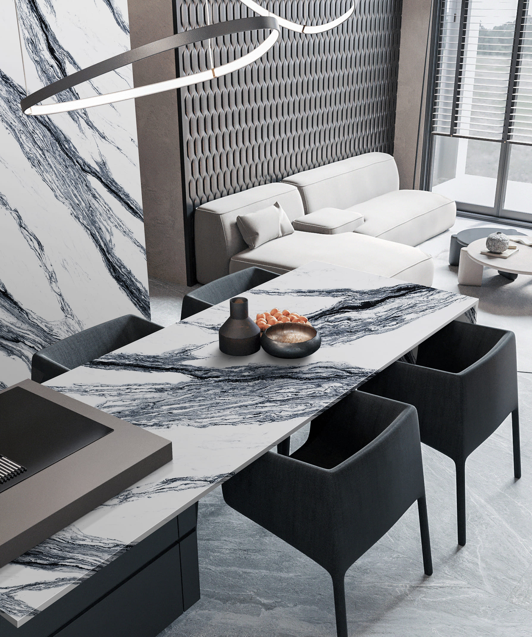 Make an unforgettable impression with the striking contrast of Panda. Inspired by the world-famous Panda White marble, this stone surface is a masterpiece of monochrome design. It delivers a bold, graphic look that is both timeless and intensely modern, perfect for spaces that demand a powerful visual anchor.